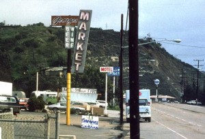 Let me tell you about this place… visualize a busy, fast, five-lane highway… as you look south the Pacific Ocean is on your right… and out on the waves surfers in black wetsuits dip and swirl like blackbirds waiting to ride the Perfect 10… the beach itself, the sand is dirty brown and littered with beer cans, pop bottles, candy wrappers, condoms, thongs, broken glass, bikini tops, popsickle sticks, roach clips… you scale a scrubby incline infested with lizards and snakes to the highway… the Pacific Coast Highway… and you wait for a brief gap in the traffic and run across the five lanes to the other side… avoiding a dirt road that leads down to the Snake Pit, a hippie settlement of busted trailers and tarpaper shacks, home to drifters, drug addicts, artists, poets, thieves, psychos (Manson once stayed here), and a 14-year-old Lolita named Angel Love… and you end up in front of Georges Market, Hawg Heaven as it’s called…
